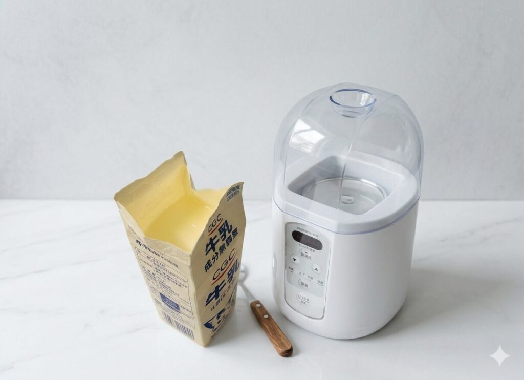 牛乳に市販のヨーグルトを混ぜて、ヨーグルトメーカーに入れるだけ!